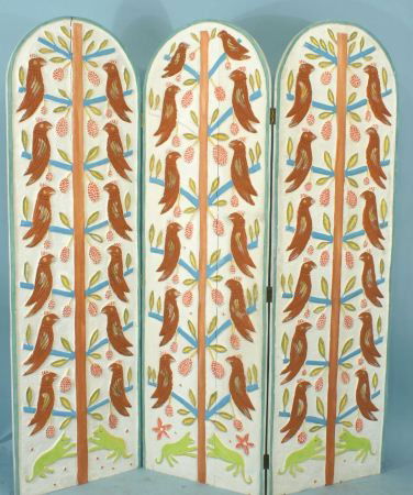 VINTAGE THREE-PANEL CARVED AND PAINTED SCREEN