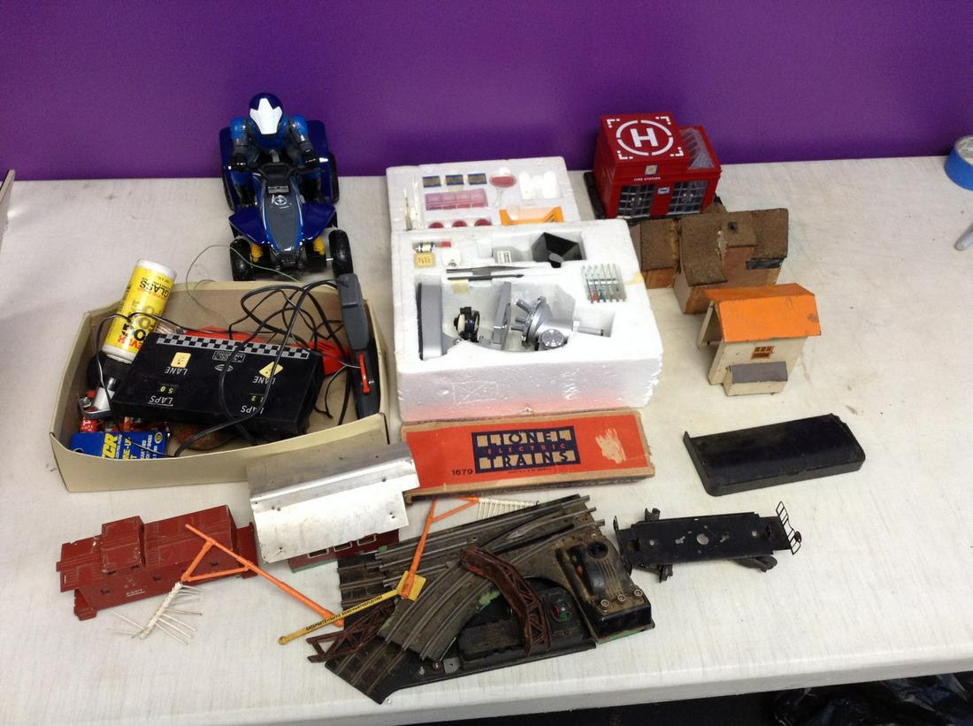 Vintage Train set pieces, Microscope, Remote Control Car and more