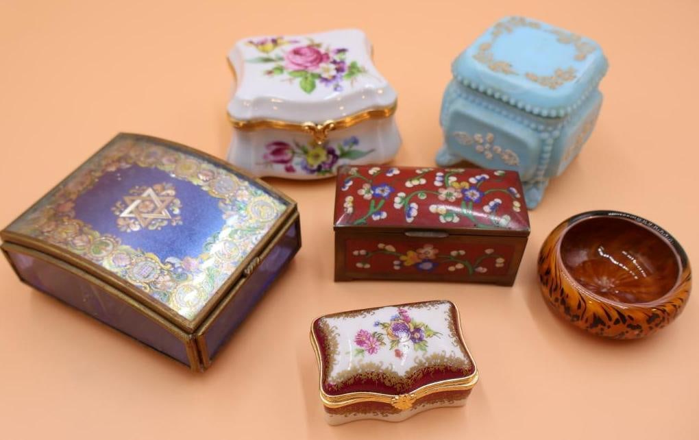 LOT ANTIQUE BRONZE BOXES, VANITY ITEMS, ETCMar 07, 2026Lot Wood, Porcelain, & Marble Dresser BoxesMar 04, 2026Onyx, Porcelain & Enamel Trinket Boxes 4pc LOT4 days LeftLot of Mostly Ceramic Items - Chinese, Japanese.6 days LeftLot 6 19th C Lithographed Tin Christmas BoxesMar 07, 2026VANITY ASSORTMENT: FOSTORIA 'JENNY LIND' PIN BOX, WEIMAR GERMANY DRESSER BOX AND HAIR RECEIVER, &4 days LeftMeissen Porcelain Items3 days LeftJoblot 7 Vintage Pill Boxes Trinket BoxesFrench Limoges Porcelain Trinket Box, 74 days LeftLimoges Painted Porcelain Trinket Boxes, 13Mar 12, 2026A group of European porcelain boxesMar 10, 2026COLLECTION OF MID-CENTURY POWDER BOXES4 days LeftSix Limoges Porcelain Trinket Boxes5 days LeftVintage Trinket Boxes incl Pill Box Italy / Firenze Il Duomo, Limoges Castel France Cobalt Blue2 days LeftCloisonne Enameled Lidded Boxes Teapot and Dishes (7)Mar 28, 2026A Collection of Art Nouveau Style Jewelry and Trinket BoxesMar 01, 2026