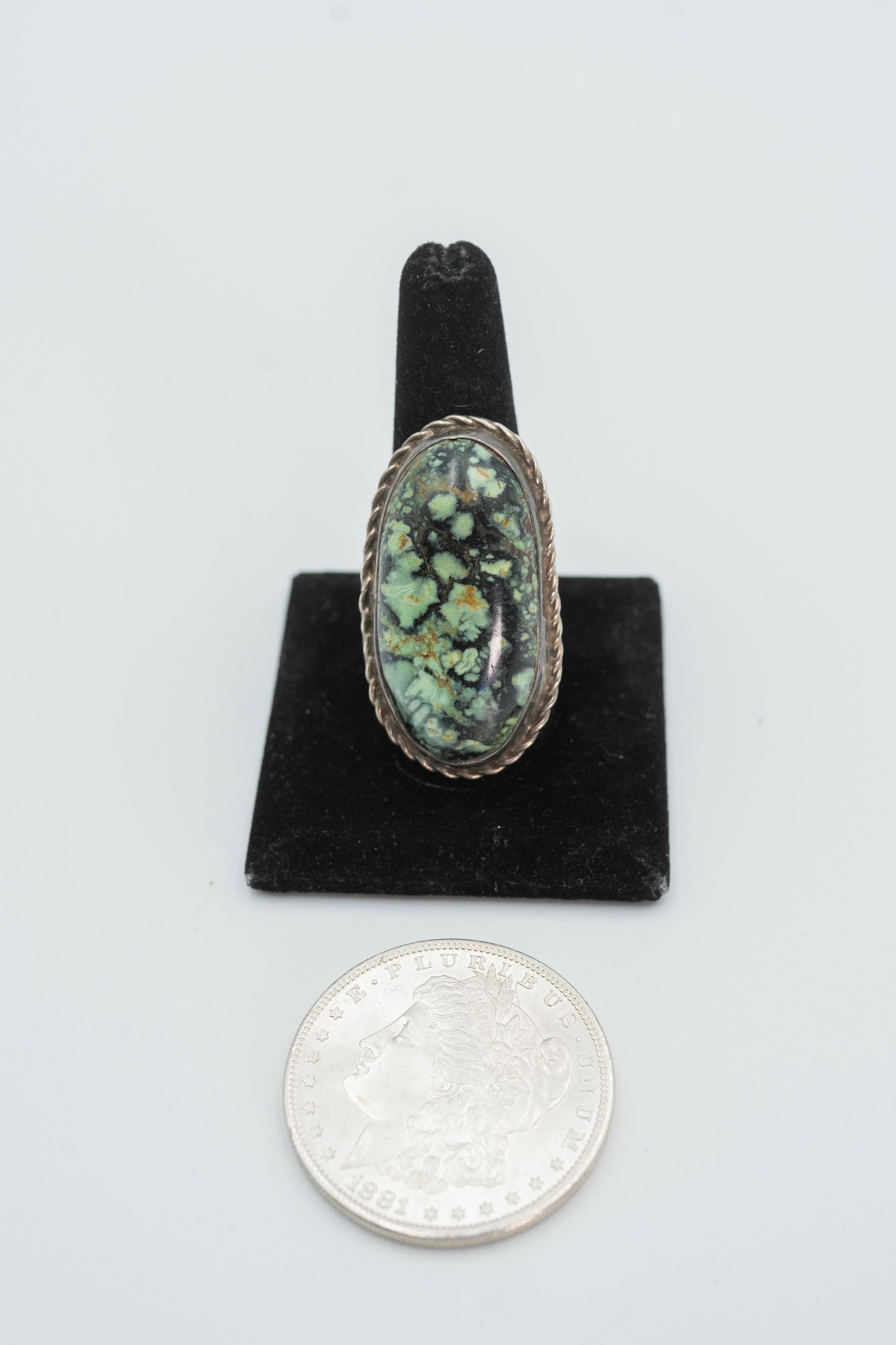 SoldVintage Variscite Large Sterling Silver RingNative American Navajo vintage sterling silver Variscite gemstone L 1/34" x W 3/4" surrounded by sterling silver twisted wire. Size 9 L 1 7/8" x W 1"See Sold Price