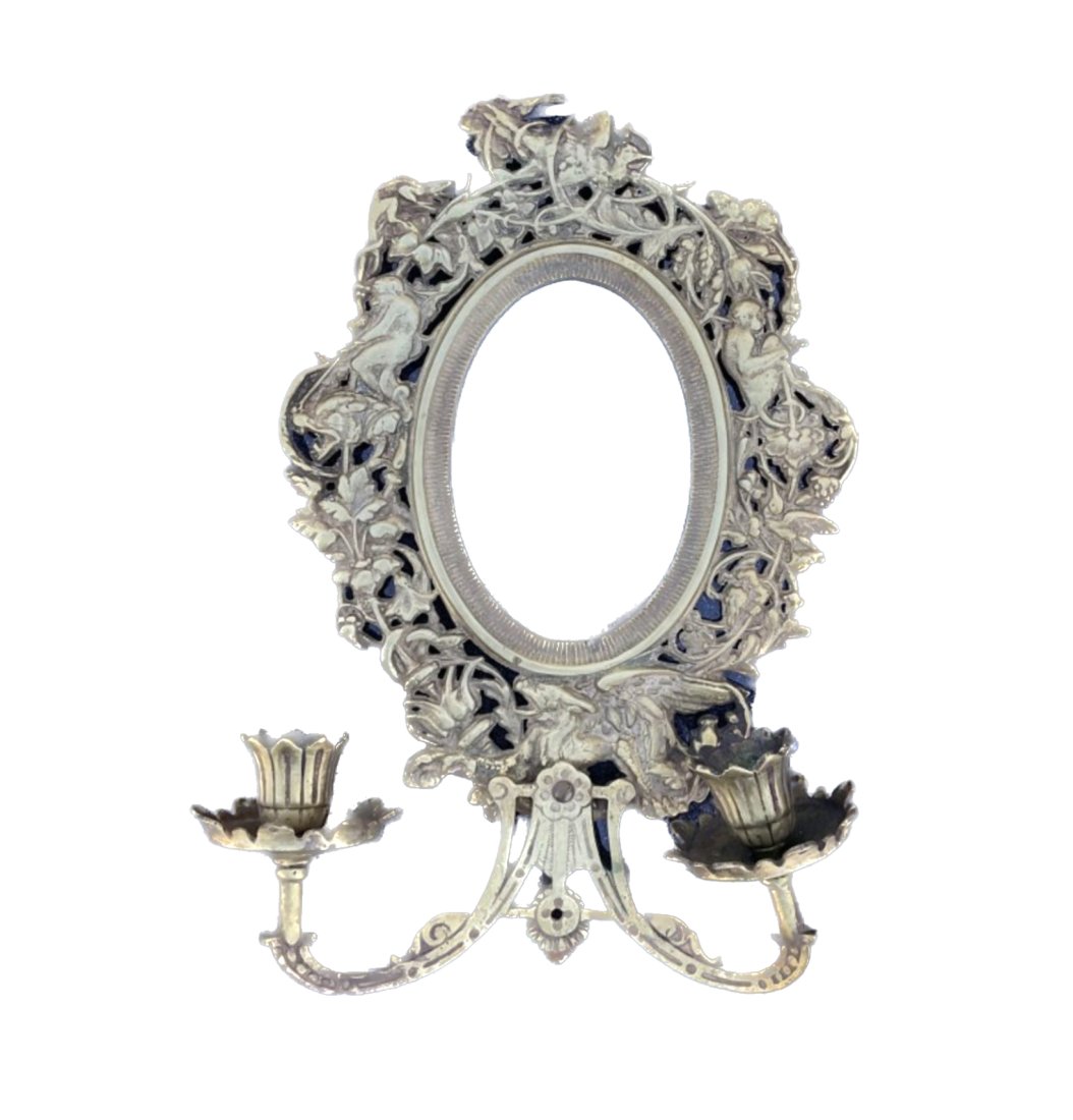 SoldVtg Ornate Pewter Frame 2 Arm Mirror Wall SconceWall sconce has silver toned pewter frame. Piece has scrolled, leaf, and ribbon detail. Wall sconce has oval form mirror. Piece has 2 arms. Mirrored wall sconce is vintage. Piece measures approximatelSee Sold Price