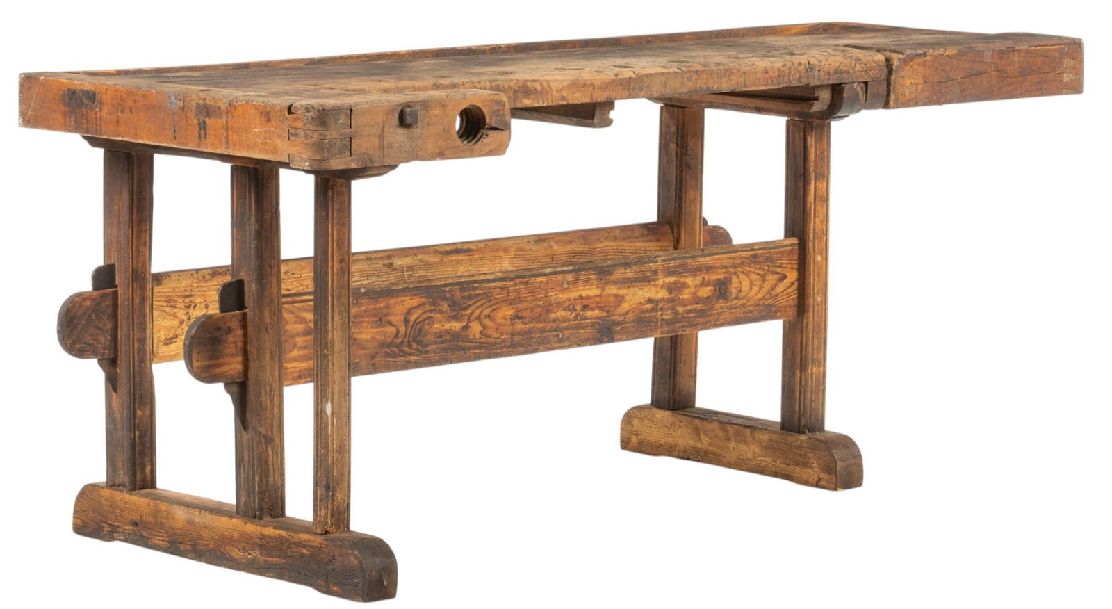 SoldVINTAGE DANISH WOODEN CARPENTERS WORKBENCHUnsigned. Dimensions: H 32.5" x W 93.75" x D 36" Condition: Wear to top from use including, marks, scratches, paint marks. E238aSee Sold Price