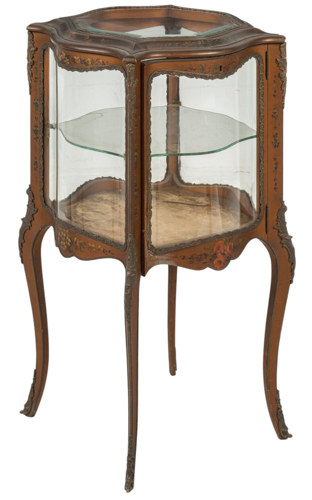SoldFRENCH MAHOGANY TABLE VITRINE, BRONZE MOUNTS 19TH.C. HFRENCH MAHOGANY TABLE VITRINE, BRONZE MOUNTS 19TH.C. H 30"" W 24" D 17" Louis XV style, oval shape. Beveled inset glass top hinged to open, and four curved glass side panels. Quality crisp detailed brSee Sold Price