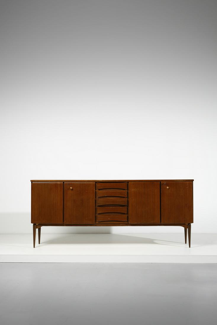 SoldITALIAN MID-CENTURY MODERN MAHOGANY SIDEBOARDItalian mid-century modern mahogany sideboard, attributed by consignor to Vittorio Dassi (Italian, 1893-1973), c.1950s, four doors, opening to interior shelves, rising on angled legs, approx 55.75"h,See Sold Price