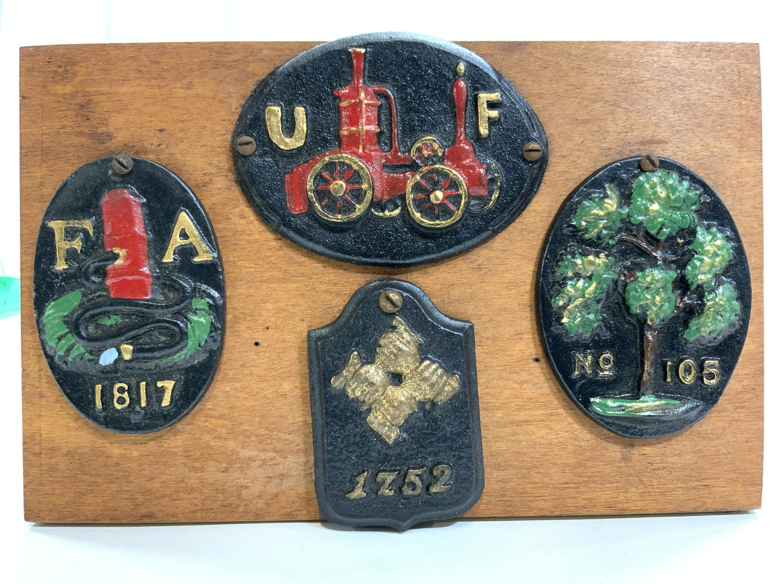 Vntg Assorted Iron Plaques On Board
