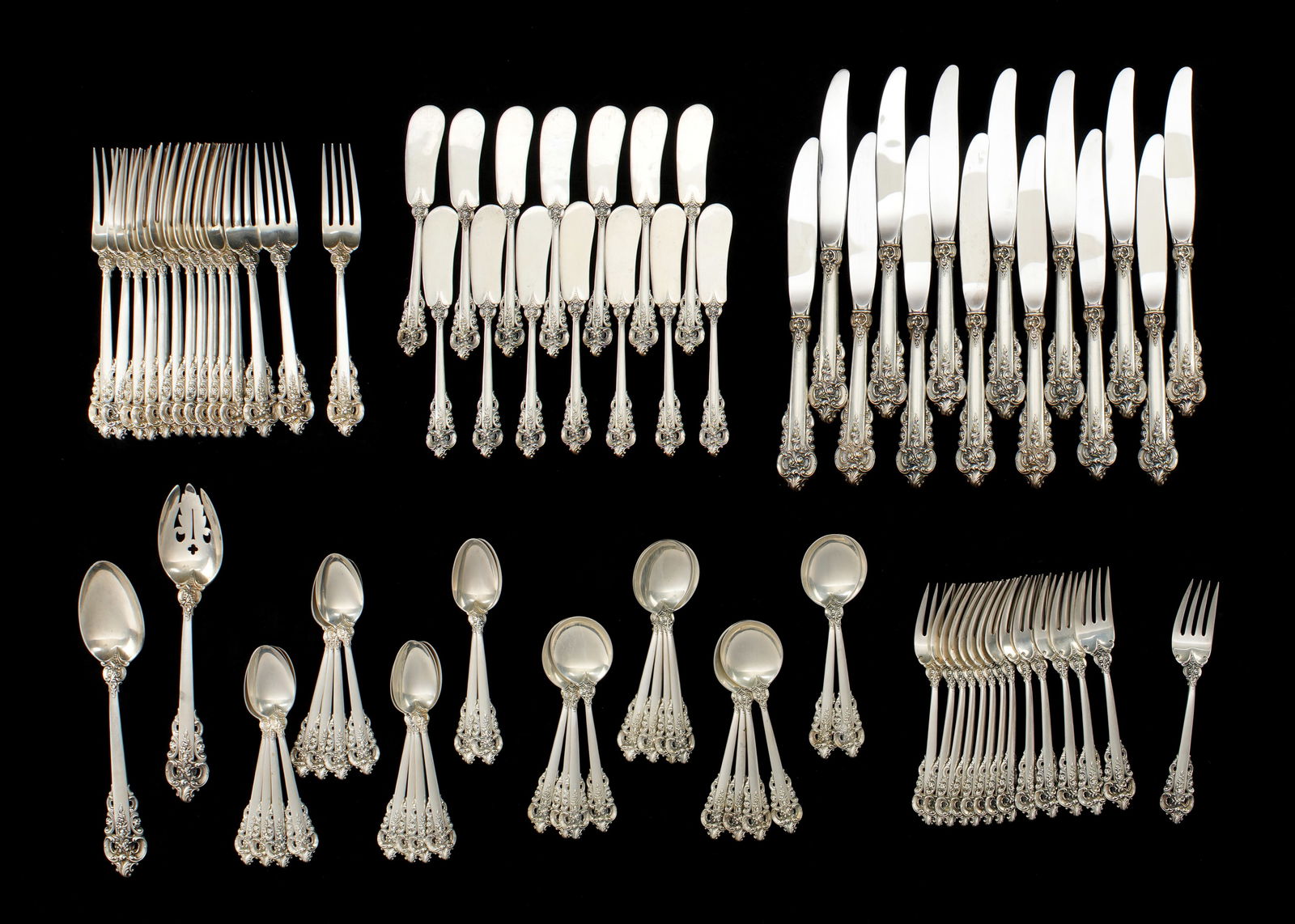 SoldWallace Grand Baroque Sterling Flatware ServiceWallace Grand Baroque Sterling Flatware Service for Twelve. Comprised of twelve dinner forks, twenty-four salad forks, twelve seafood forks, one lemon fork, twelve ice cream forks, two pickle forks, tSee Sold Price