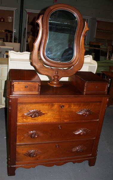 SoldVictorian carved walnut chest of drawers w/ mirrorVictorian carved walnut chest of drawers w/ mirror, three drawers, carved leaf pulls, 39-3/4"h x 41"w x 17"d, mirror 45"h x 25"wSee Sold Price
