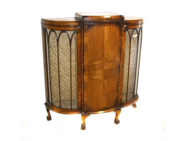 SoldPair of Half-Round Walnut Display Cabinets.These cabinets are fabric lined, with glass shelves and storage in the bottom section. The cabinets are intact with no pieces missing, but the finish is unrestored. One of the Cabinets look like it haSee Sold Price