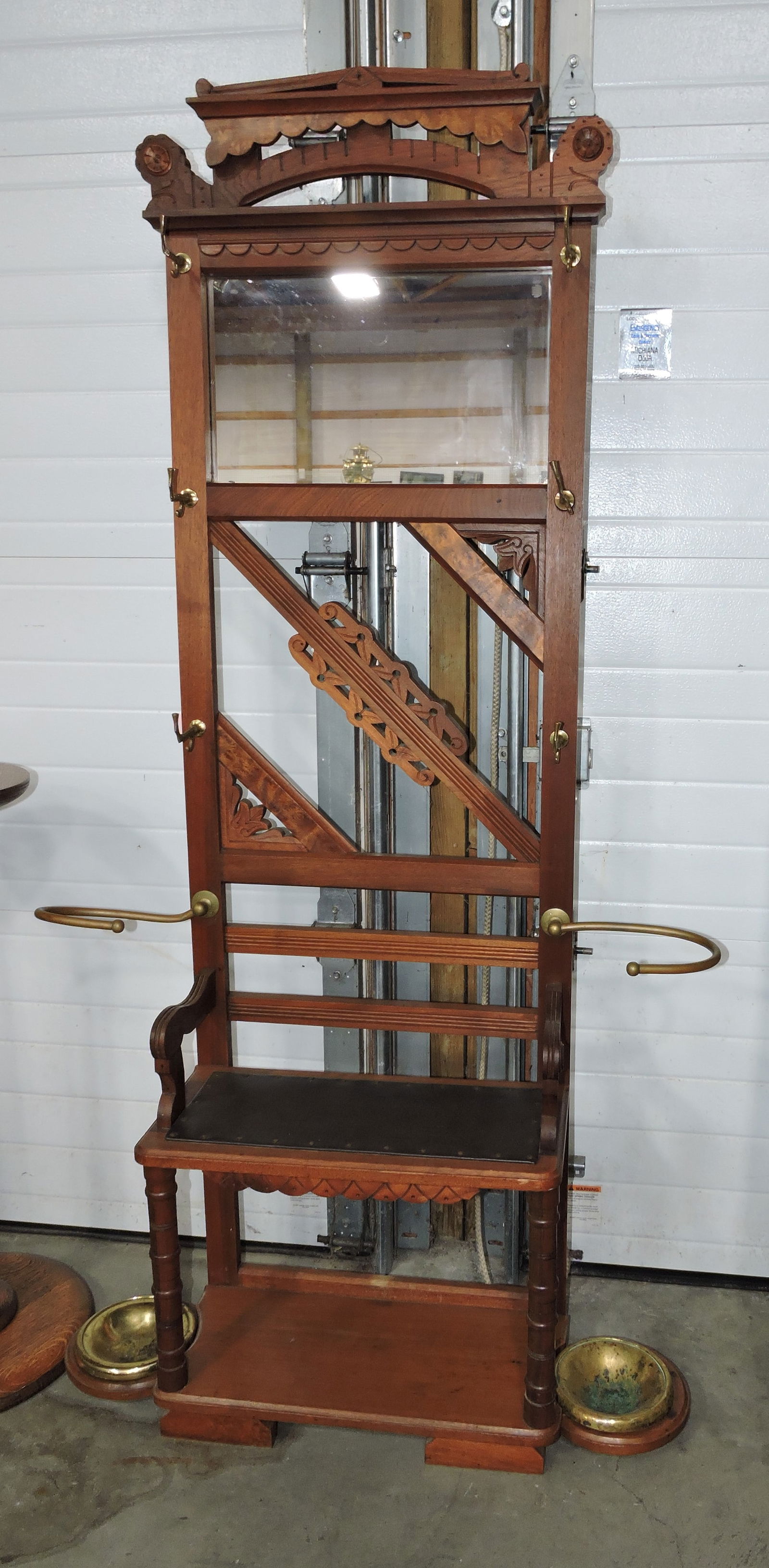 Walnut hall tree with mirror, brass coat
