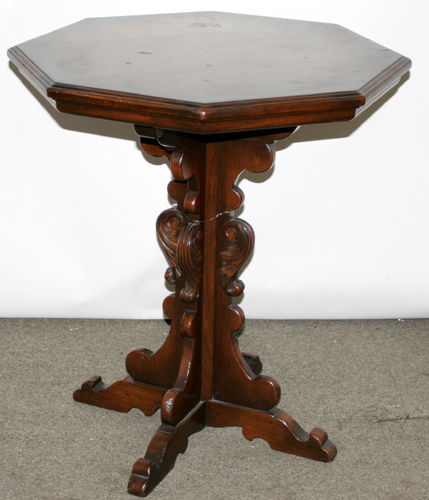 WALNUT OCTAGON PEDESTAL TABLE, CARVED
