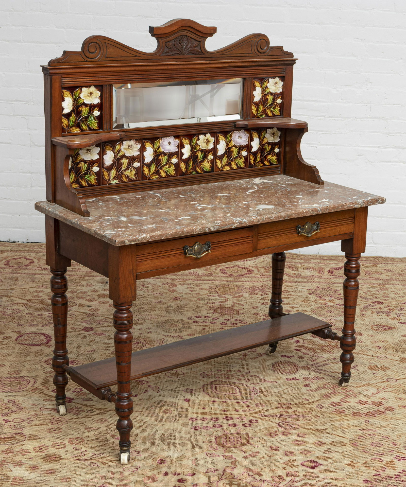 WALNUT, TILE AND MARBLE TOP WASH STAND