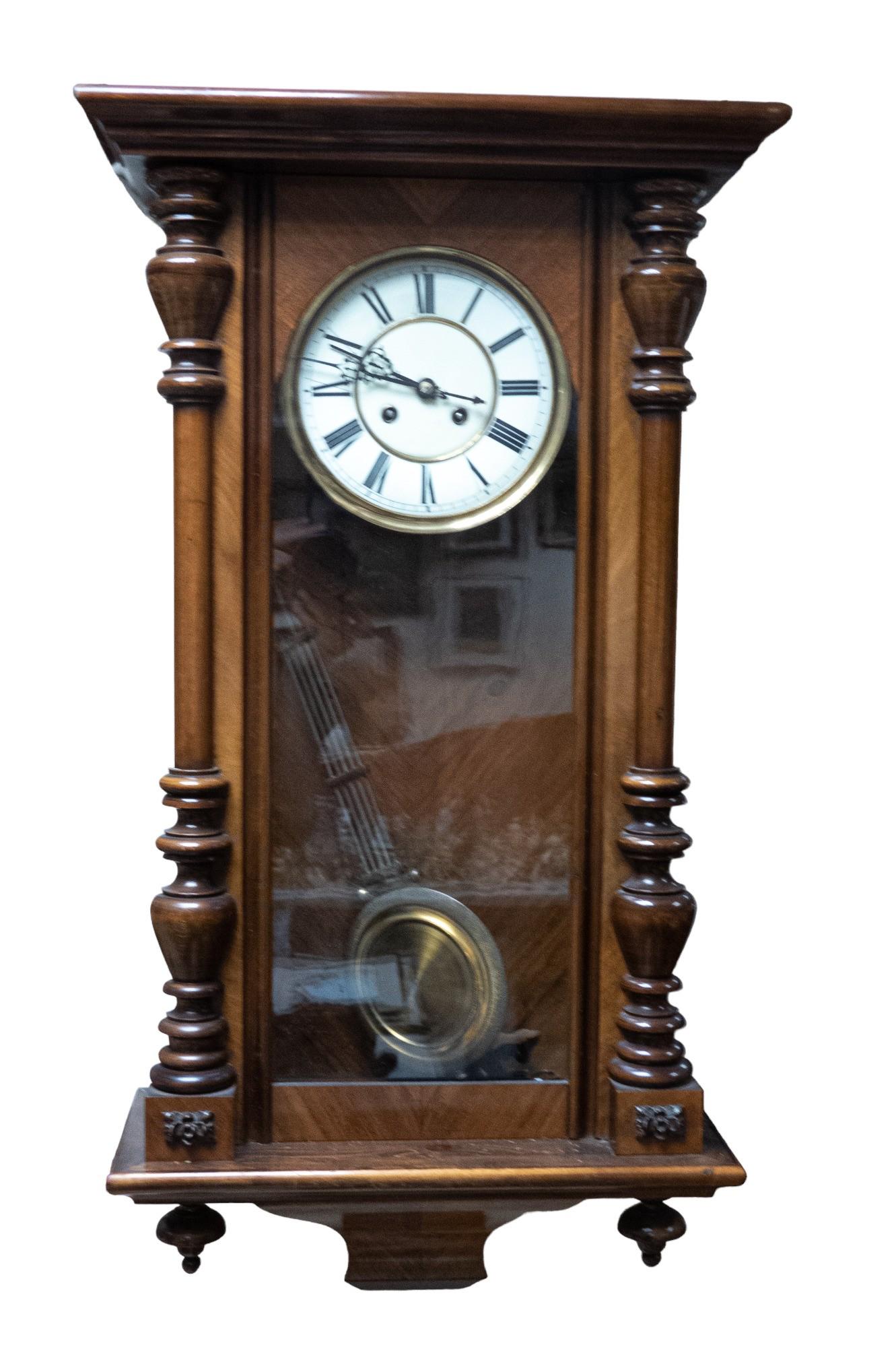 Walnut Vienna wall clock, sprung movement with pediment missing, length 90cm