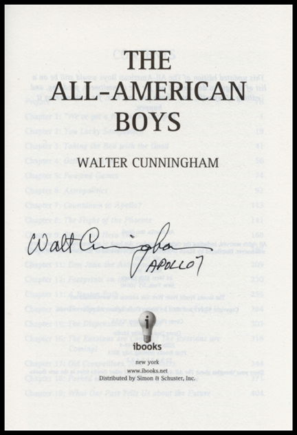 SoldWalt Cunningham - Iconic Apollo Astronaut - Autographed "The All-American Boys" Hardcover BookDetails: Walt Cunningham autographed "The All-American Boys" hardcover book. Near fine condition. Authentication: Includes a full letter of authenticity from JG Autographs, Inc. Premium: ASee Sold Price