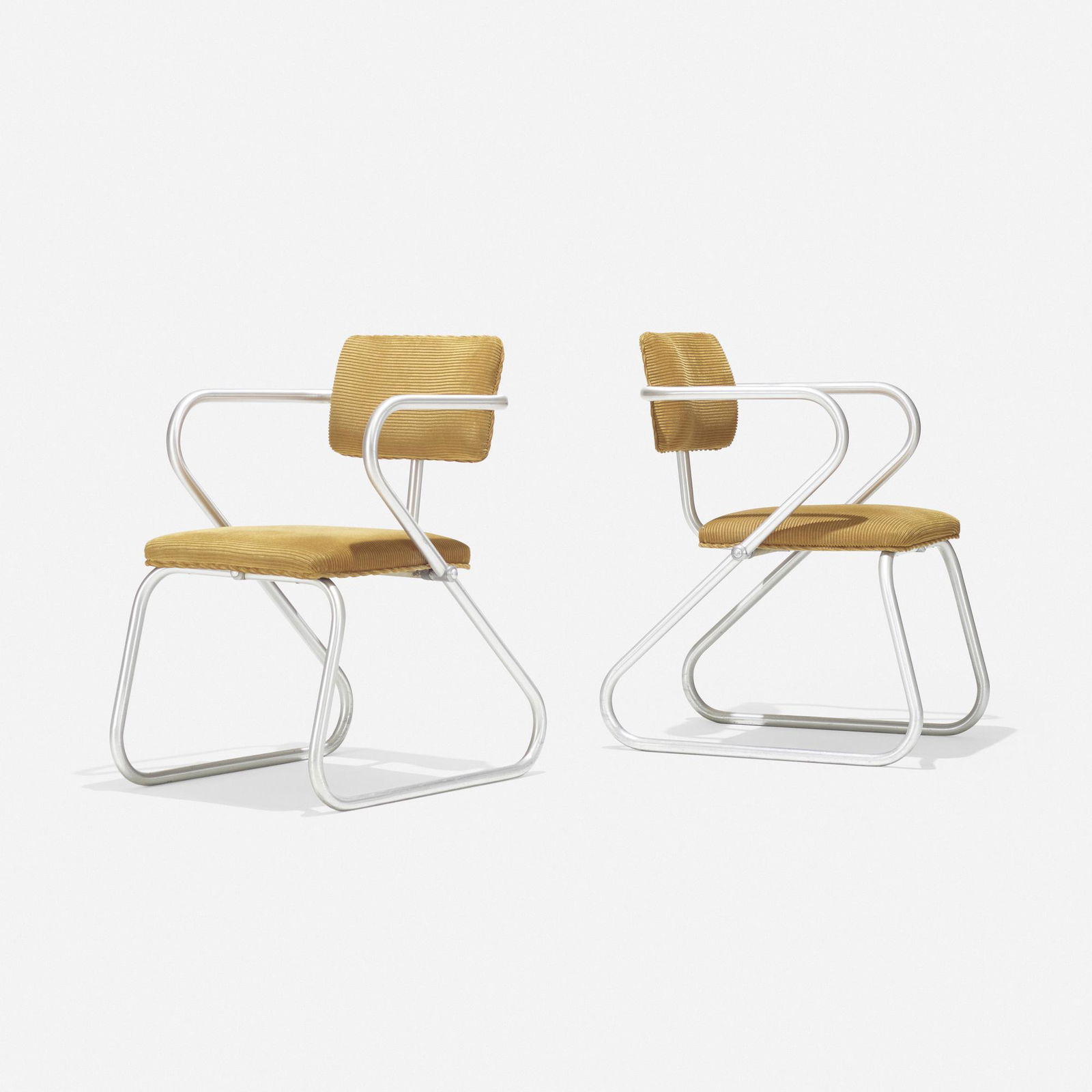 SoldWarren McArthur, Armchairs, pairWarren McArthur Armchairs, pair Warren McArthur CorporationUSA, c. 1933aluminum, upholstery, rubber 30 h x 21 w x 24.5 d in (76 x 53 x 62 cm) Provenance: Nicholas and ShSee Sold Price