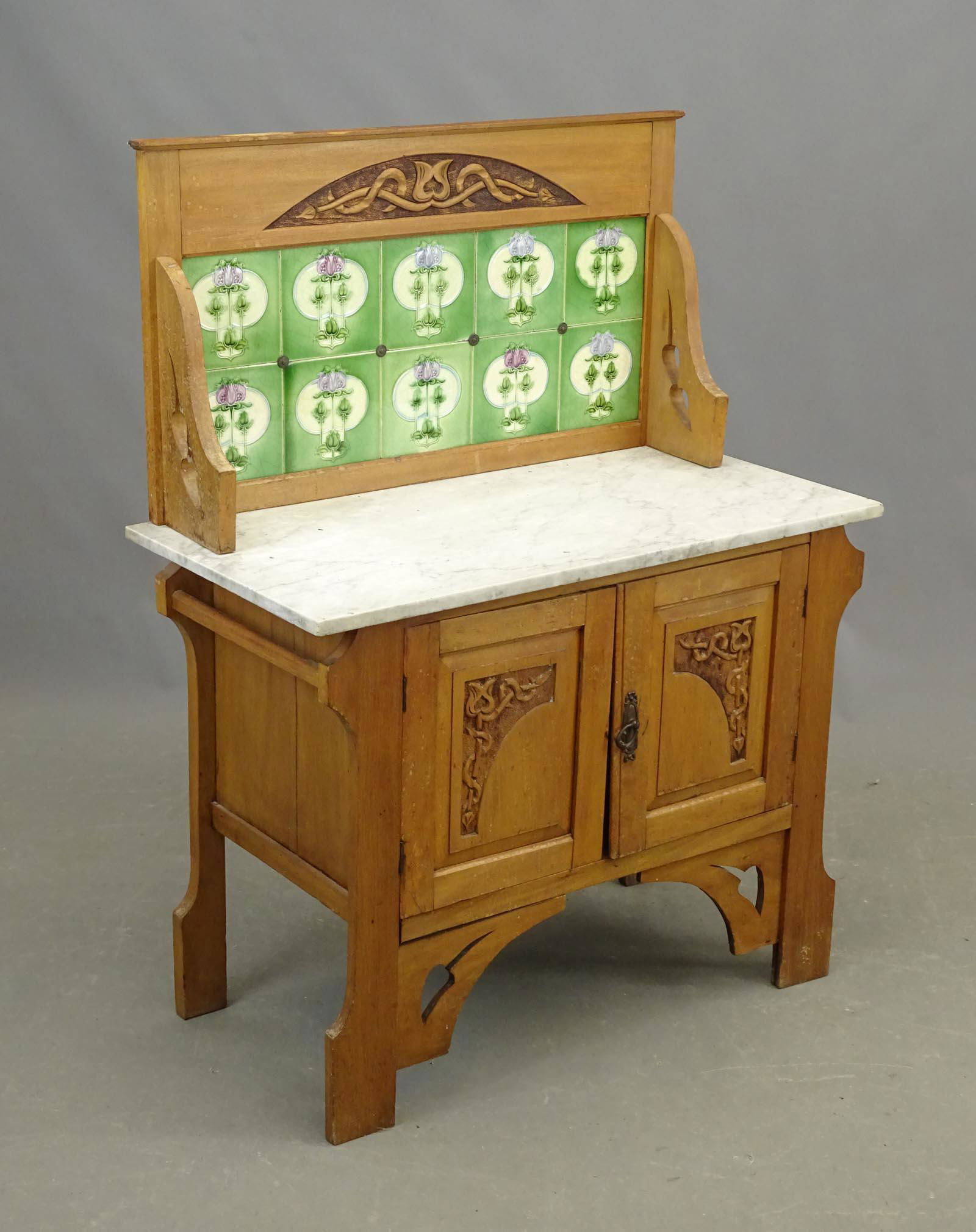 SoldAntique English Washstand Marble and tileantique Eglaih Victorian wash stand with marble top and hand painted large tile back splash. Tiles are possibly Meissen. light toned English pine frame, turned legs, key and double door cabinet. CharaSee Sold Price