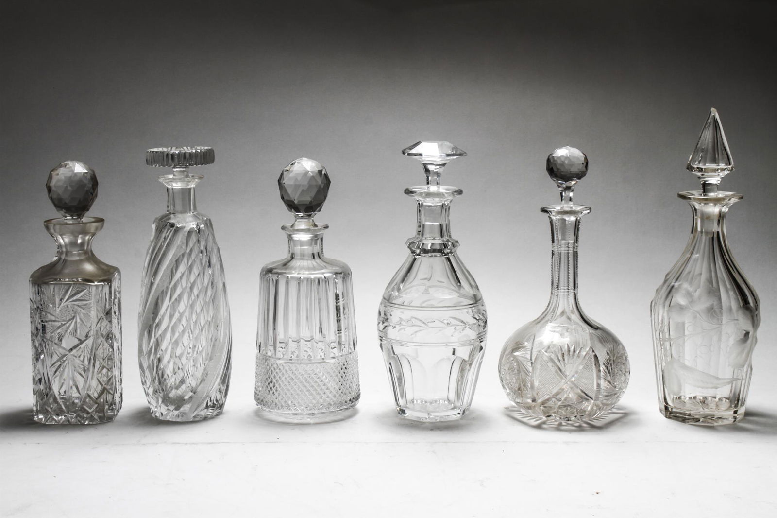 SoldWaterford Manner & Other Crystal/Glass Decanters-6Waterford manner and other colorless cut or copper wheel engraved crystal and glass decanters, group of six. From From 14" H to 9" H. Most with replaced stoppers, one with fleabite chip to stopper tipSee Sold Price