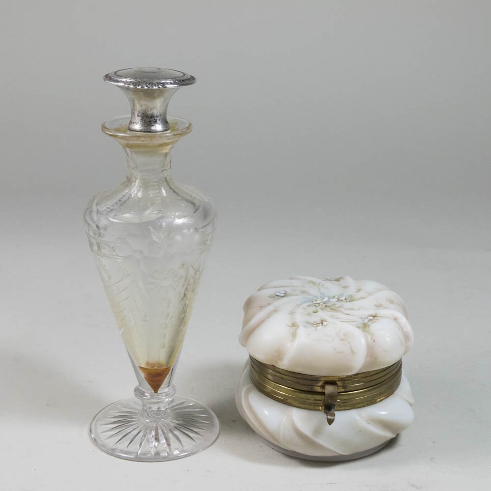 SoldEnglish Sterling Silver and Silver Plated Box, Perfume Bottle and FlaskEnglish Sterling Silver and Silver Plated Box, Perfume Bottle and Flask, 20th Century, Together with a pressed colored glass oil lamp, pewter candle holder by Selangol and a Limoges porcelain Marie AnSee Sold Price