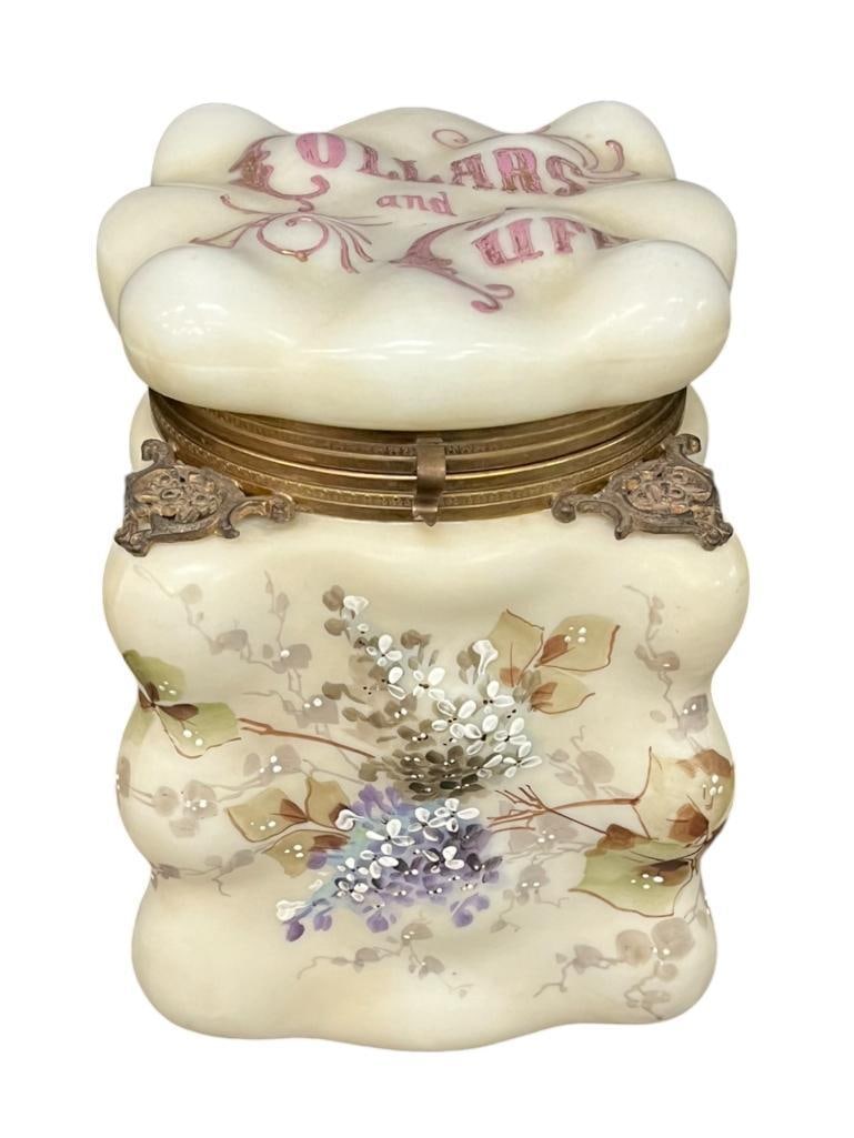 SoldWave Crest Collars & Cuffs BoxWavecrest Collars & Cuffs hinged lidded dresser box. Opaque glass, floral decoration and gilt painted lettering, gilt metal mounts. Unmarked. 7 1/4"H x 8 1/2"W including feet.See Sold Price