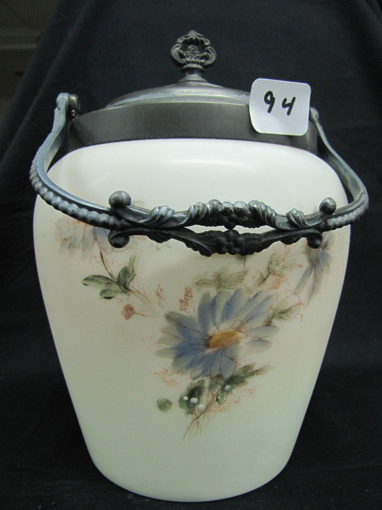 SoldWavecrest Antique Hand Painted Floral Glass Biscuit Barrel Jar Silver Plated Lid and HandleWavecrest Antique Hand Painted Floral Glass Biscuit Barrel Jar Silver Plated Lid and Handle. Light wear and tarnishing noticed, minor small stain marks, overall good shape for age. This item is in preSee Sold Price