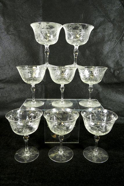 SoldGlastonbury-Lotus Etched Crystal StemwareSet of Twenty Nine (29) Glastonbury-Lotus 67-3 Etched Crystal Stemware. Includes: (14) champagne glasses along with (15) sherbets. Champagne glasses measure 6-1/8" x 3-3/4" diameter top. Sherbets measSee Sold Price