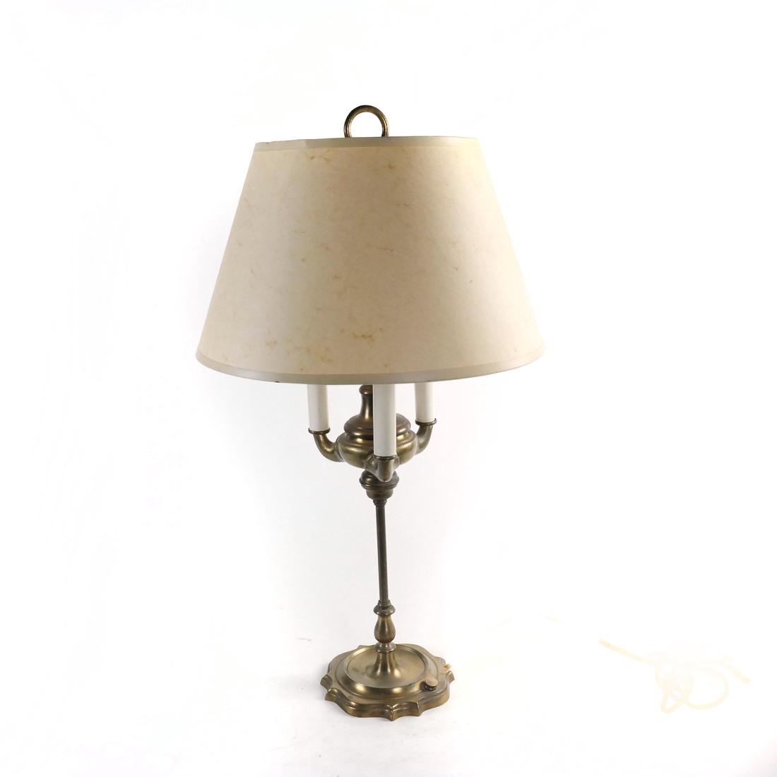 SoldBrass Bouillote Trumpet Form Desk Lamp20th Century, French brass bouillotte trumpet form desk lamp. [Whole shade: 27" H x 13" Dia]. Minor scratches.See Sold Price