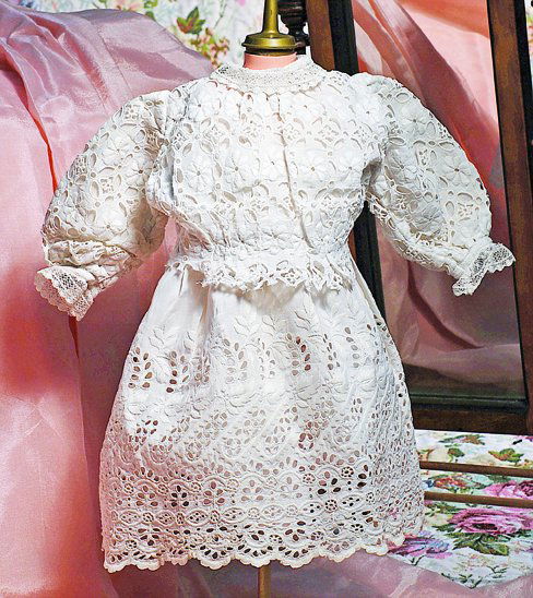 WHITE CUTWORK FROCK. 5” shoulder width, 12” length.