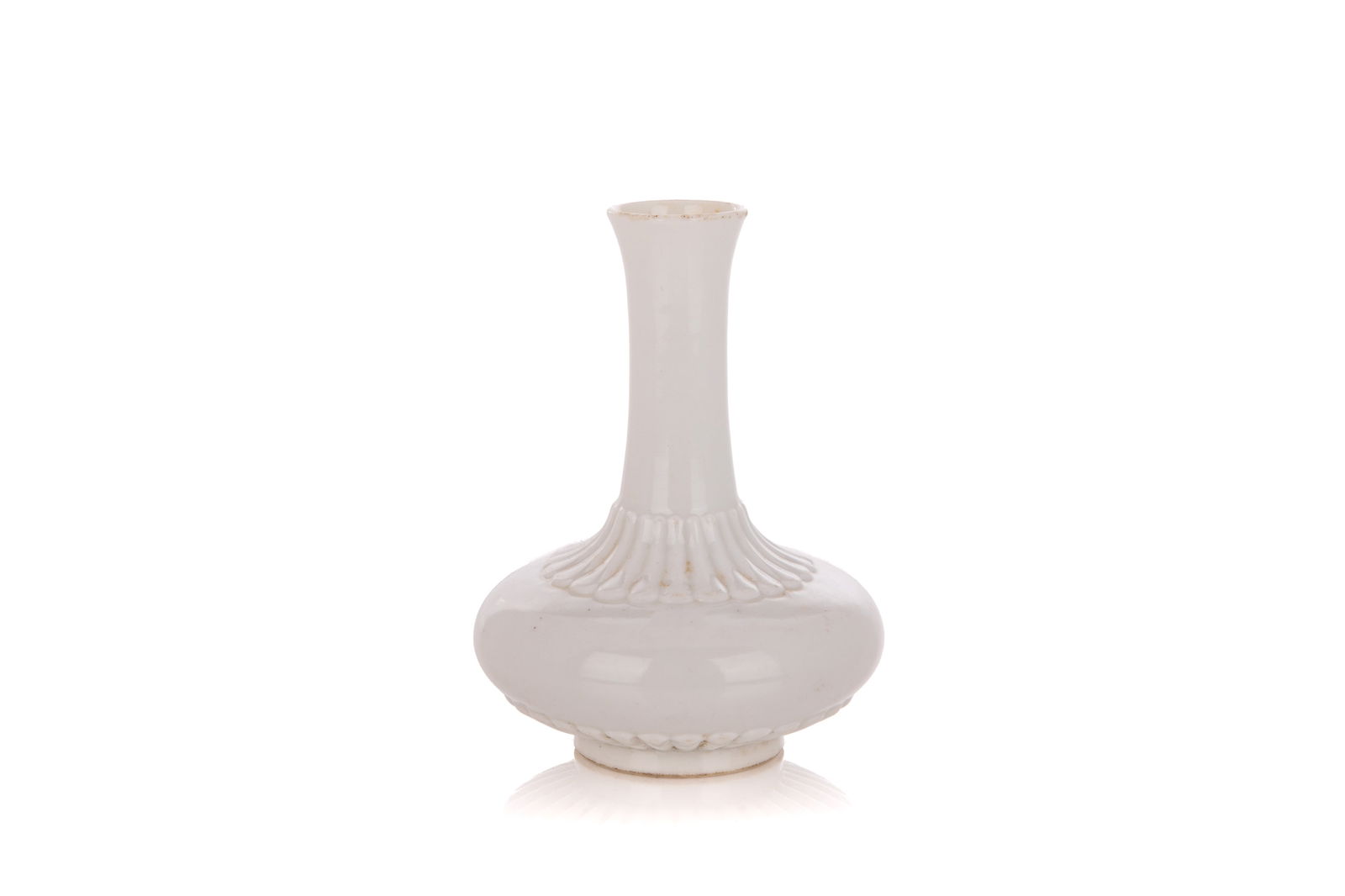 SoldA Chinese white-glazed carved bottle vase, Qing DynastyA Chinese white-glazed carved bottle vase, Qing Dynasty, the body carved with lotus flowers and with wide band of upright leaves on the neck, covered overall with a milk-white glaze. The base incisedSee Sold Price