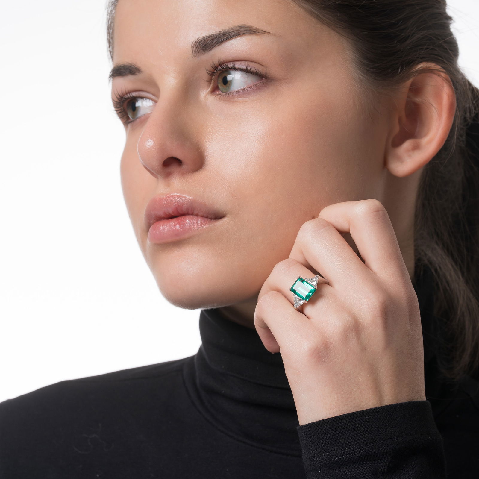 WHITE GOLD RING WITH EMERALD AND TRIANGULAR-CUT DIAMONDS