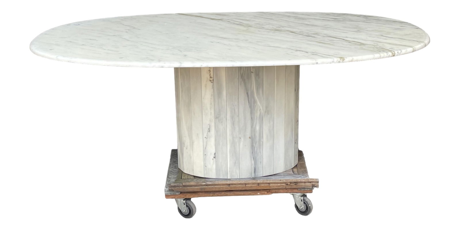 SoldContemporary Marble Dining TableContemporary Marble Dining Table, executed in white marble with gray veins, the oval top on an ovoid paneled pedestal, h. 29", w. 39-1/4", l. 78".See Sold Price