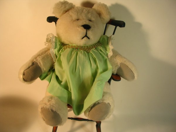 SoldBarbara Golden, Handmade Aelene White Teddy BearOne of a kind hand-crafted teddy bear. Fully jointed. Aelene is wearing a leopard print faux fur scarf and a brown headband with flowers. Comes with original tag. Shows some natural aging but in goodSee Sold Price