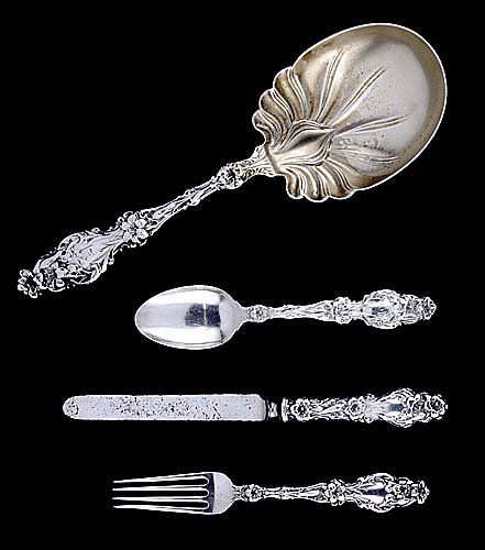 Assorted Lot of American Sterling Silver Flatware6 days LeftFRANCIS HIGGINS STERLING SILVER UTENSILS LOT OF 6Feb 15, 2026Vintage Ornate Victorian Sterling Silver Gold Washed Fork, Spoons and KnivesCollection of Whiting Lily Sterling Silver FlatwareFeb 12, 2026Five American Silver Flatware ServersFeb 12, 2026Four Whiting Arabesque Sterling Silver TeaspoonsFeb 12, 2026Four Sterling Silver Flatware ServersFeb 12, 2026Three Sets Of Assorted Silver Flatware,Tiffany 3 Pc Sterling Children's Flatware Set Plus 1 Baby Spoon21 hrs LeftSet of Eight Whiting Lily Sterling Silver Fruit SpoonsFeb 12, 2026Wallace Grand Baroque Sterling Silver Flatware Service for EightFeb 12, 2026Collection of Gorham Chantilly Sterling Silver FlatwareFeb 12, 2026Three Small Sets of Sterling Silver FlatwareFeb 12, 2026Gorham Chantilly Sterling Silver Flatware ServiceFeb 12, 2026Lily by Watson Sterling Silver Flatware Set 73 Pieces for 8 Art Nouveau Floral5 days LeftReed & Barton Tara Sterling Silver Flatware ServiceFeb 12, 2026