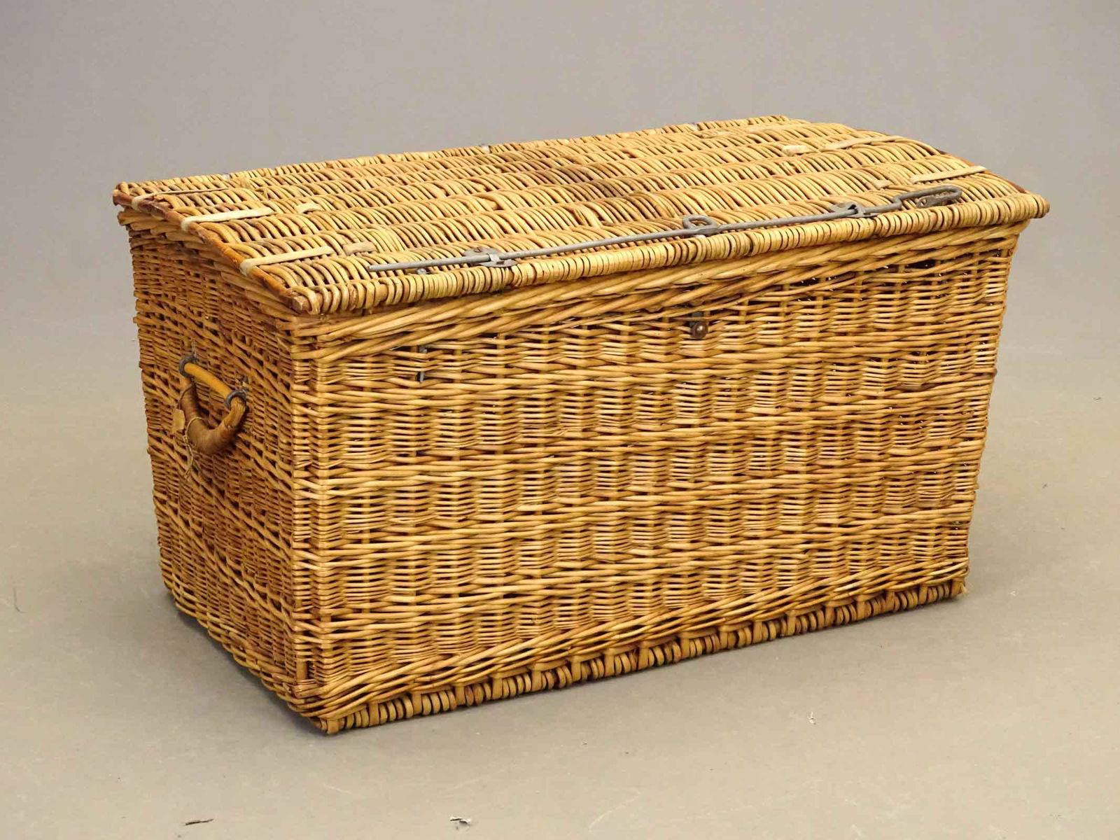 SoldANTIQUE WICKER TRUNKEarly 20th century large wicker trunk with wicker handles and spring hinges. Dimensions: H 21" x W 34" x D 21" Condition: Not rigid; flexible. A few splits. Some age toning to the edges of the exterioSee Sold Price
