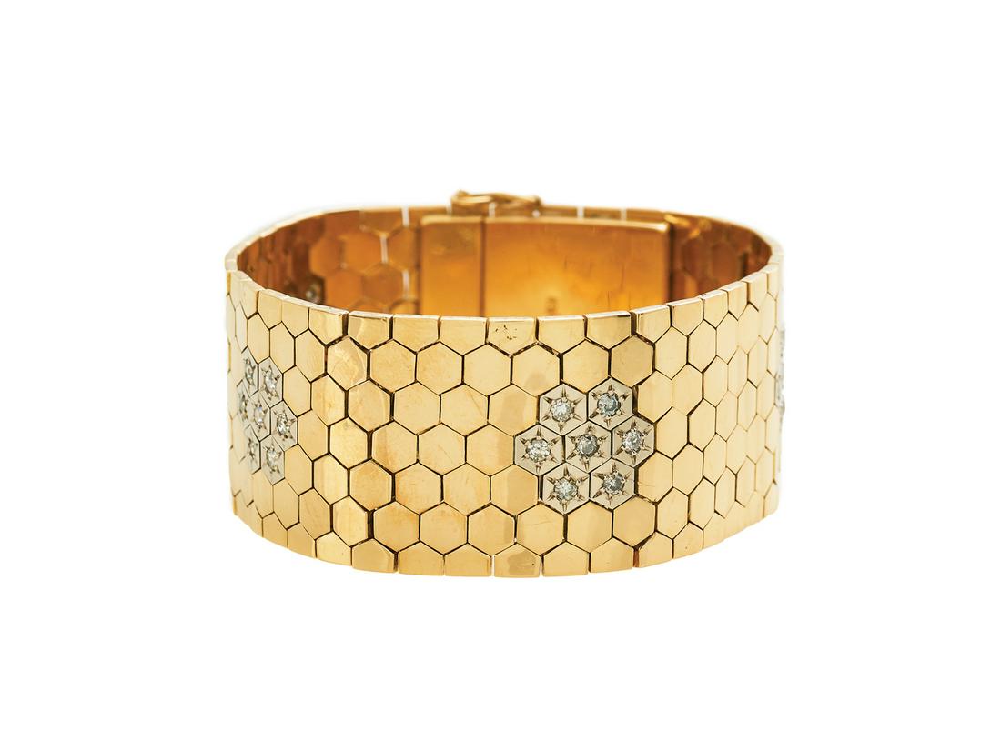 SoldWide Diamond BraceletWide Diamond Bracelet 18k yellow gold, the polished gold bracelet in a honeycomb design, mounted with stations of single-cut diamond clusters weighing approximately 1.28 carats in total. w. 1", l. 7-1See Sold Price