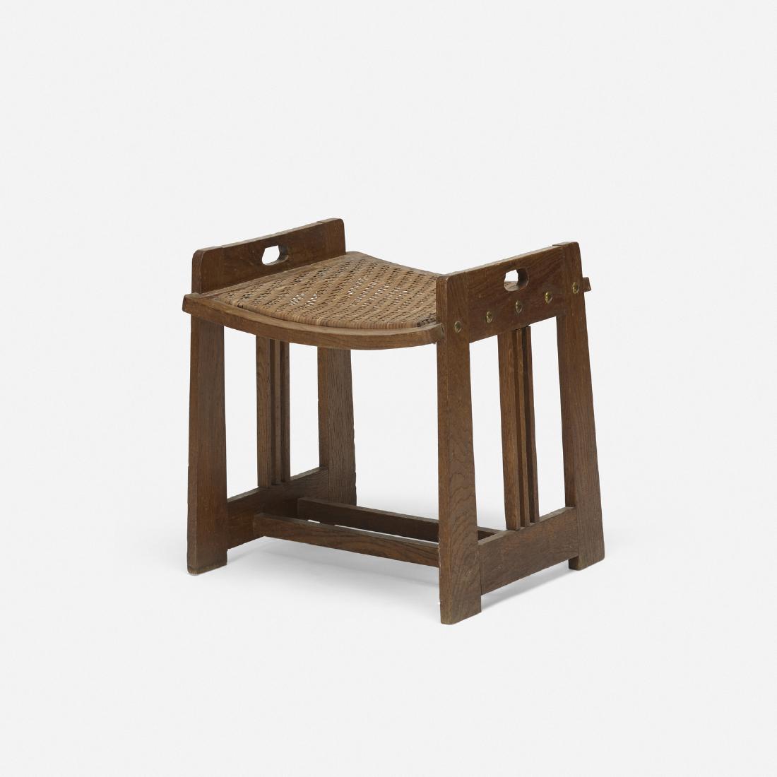 SoldArts and Crafts stoolAn Arts and Crafts Period Oak stool. Circular top with six legs, stretcher base and hammered Copper rivets. Old, worn finish. 16" high. ESTIMATE $100-150See Sold Price