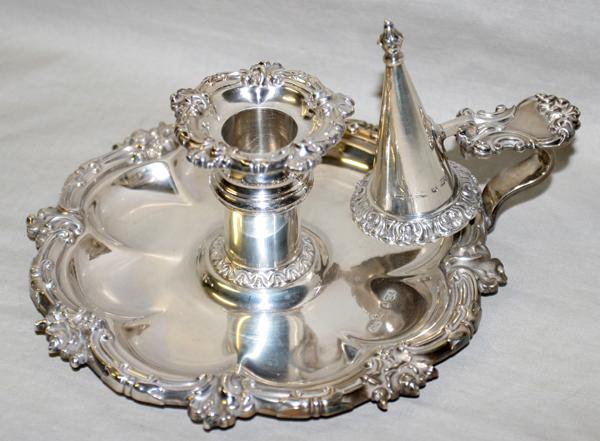 WILLIAM IV SILVER CHAMBER STICK WITH SNUFF,