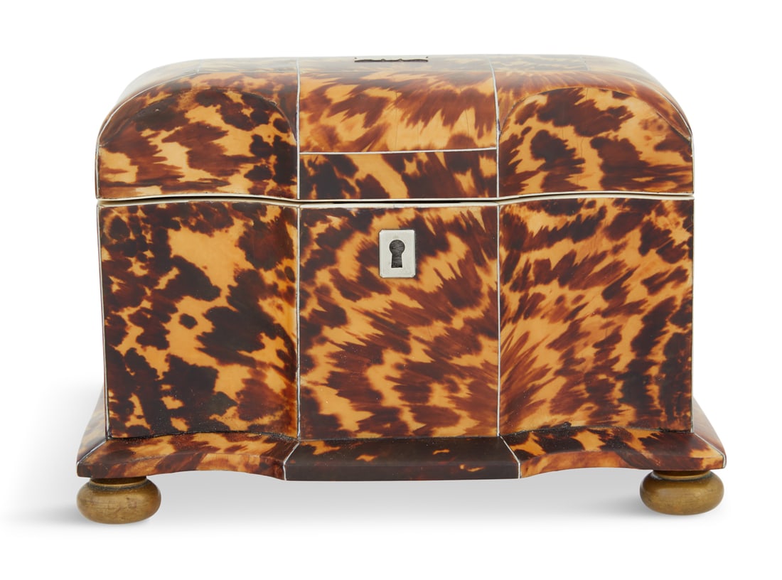 SoldWilliam IV Tortoiseshell Serpentine Tea CaddyRare William IV Silver-Inlaid Tortoiseshell Serpentine Tea Caddy, second quarter 19th century, on brass ball feet, the sides and cover veneered in figured tortoiseshell, the serpentine front veneeredSee Sold Price