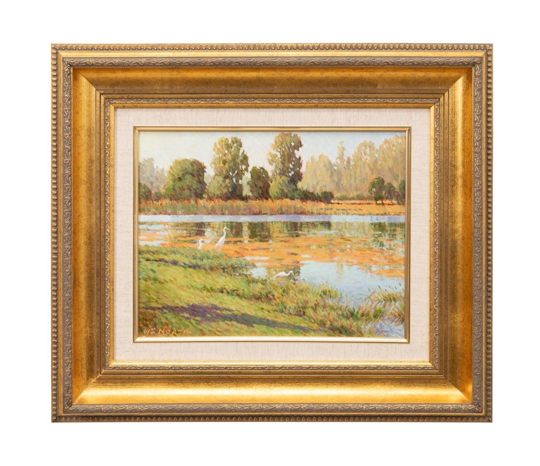 WILLIAM NORTH, POND LANDSCAPE WITH CRANES, O/C