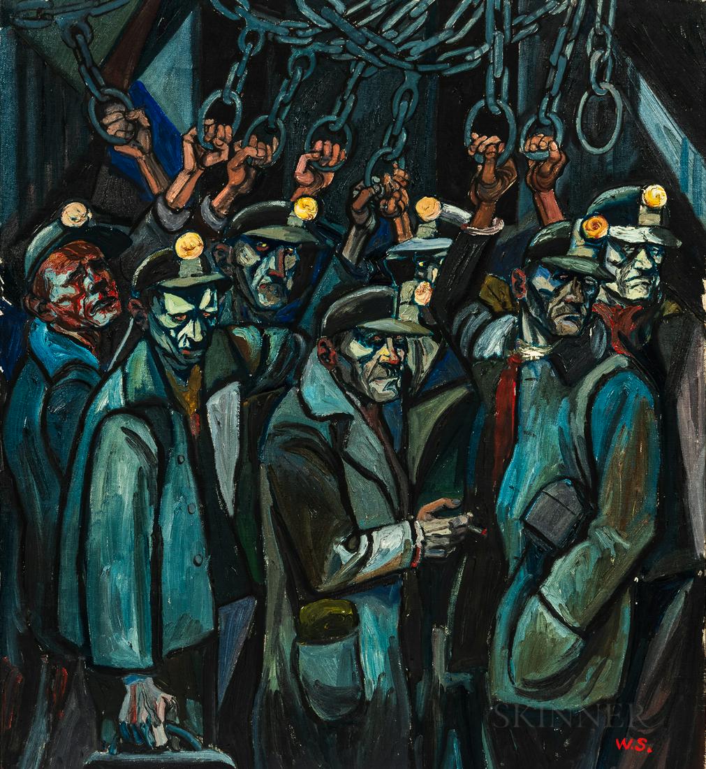 William Sharp (American, 1900-1961), Miners Going Underground, Initialed "W.S." lower right.,