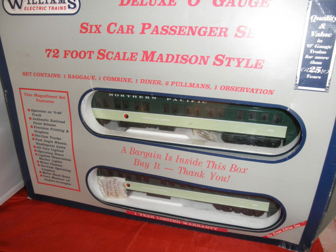 SoldWilliams Deluxe O gauge four car passenger setWilliams Deluxe O gauge four car passenger set, 60 foot Madison Style in original box with shipping box, stock #M1021See Sold Price