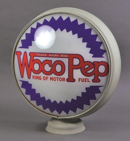 SoldPep 88 Ethyl Milk Glass Gas Pump GlobeThis is a single lens Pep 88 Ethyl. It does show some light discoloration near the bottom edge. The original narrow milk glass body has a crack on the left side near the attachment screw. 13.5" lens.See Sold Price