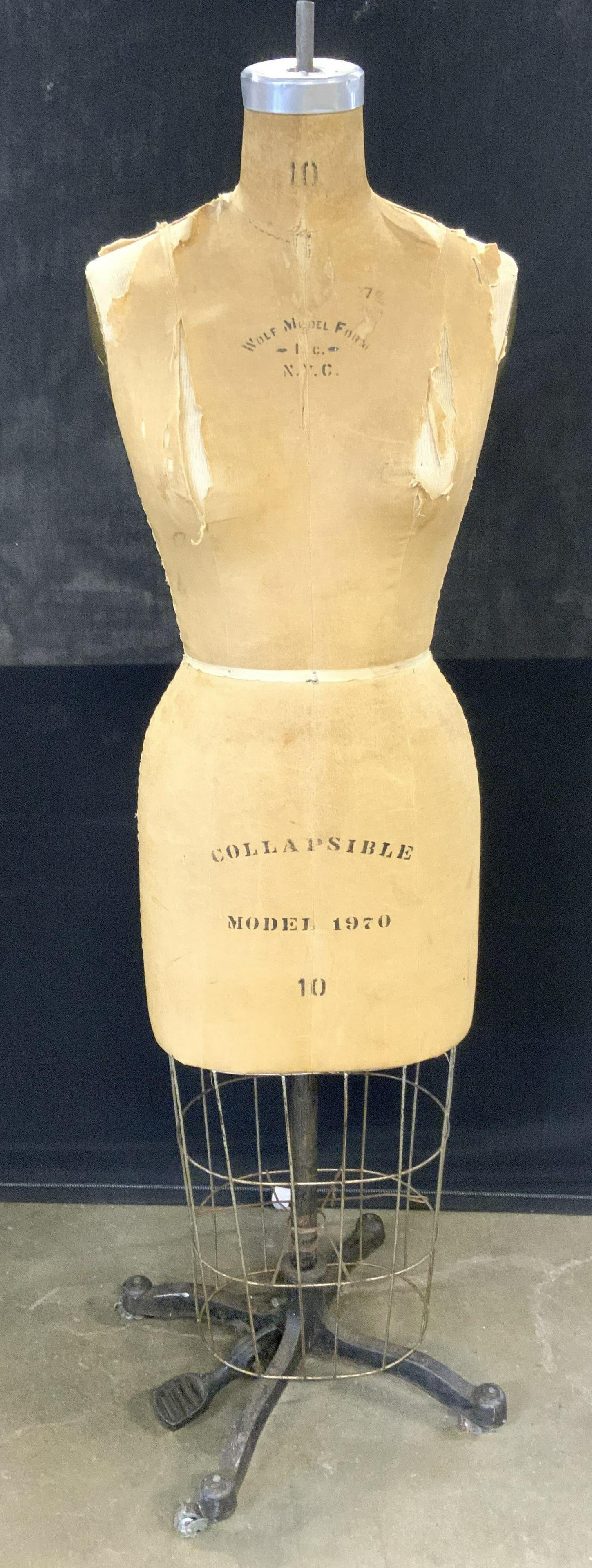 SoldWolf Form Collapsible Dress Female Model 1950, MannequinWolf Form Collapsible Dress Female Model 1950, Mannequin. This is a fantastic full-body dress form with a rolling cast iron base. On the top of the form reads, "Wolf Form Co. NY" stamped is, "Special,See Sold Price