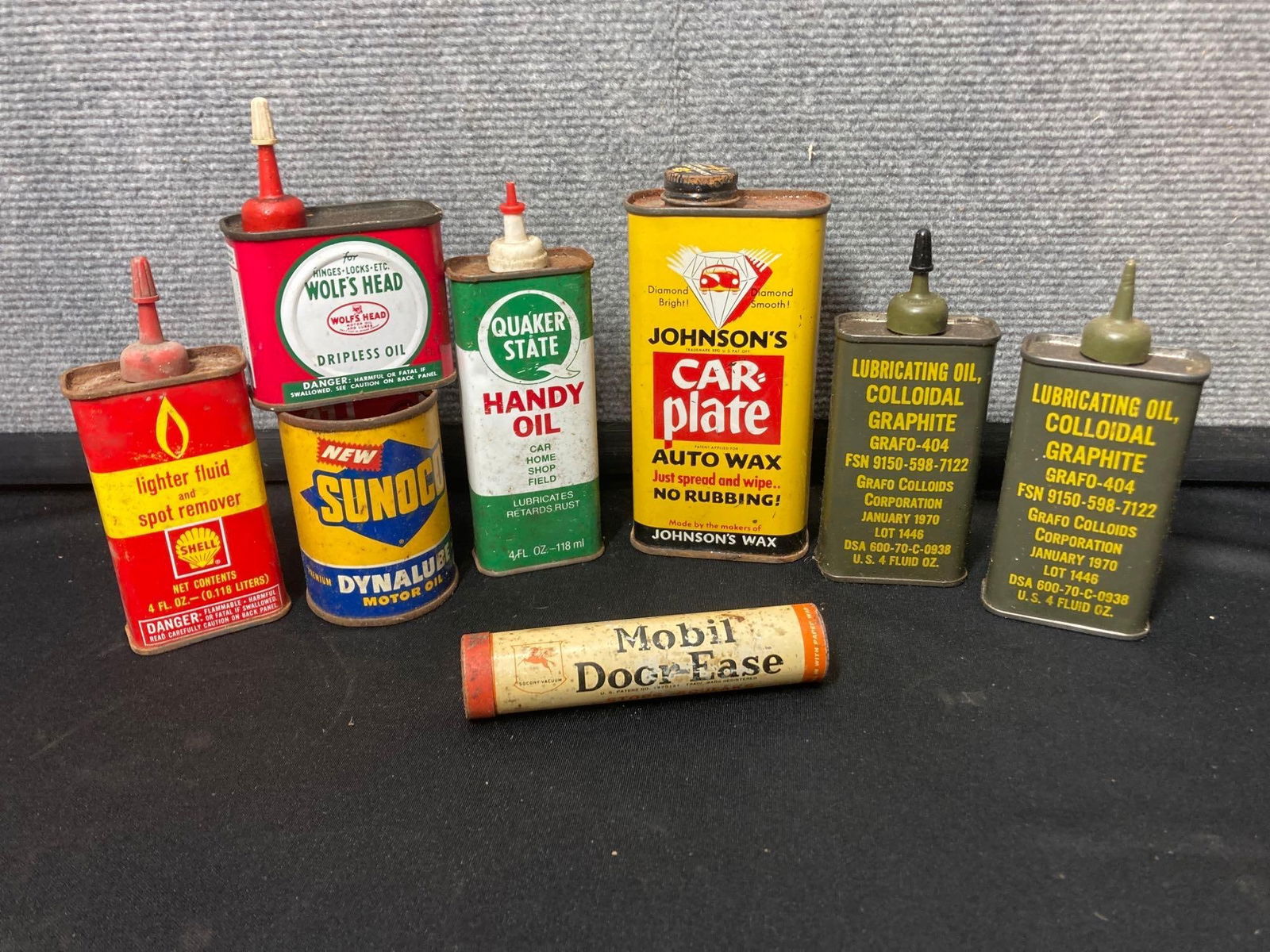 Wolfs Head, Quaker State, Sunoco, and other tins