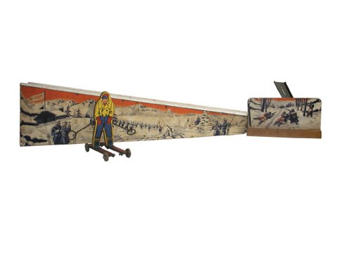 Sold2 VINTAGE WOLVERINE TIN SKI JUMPS2 Vintage 1940's Wolverine Tin Litho Ski Jump Toys, Including an Early 1st Version with Cardboard/Paper Litho Ski Jump Sides. 26" L.See Sold Price