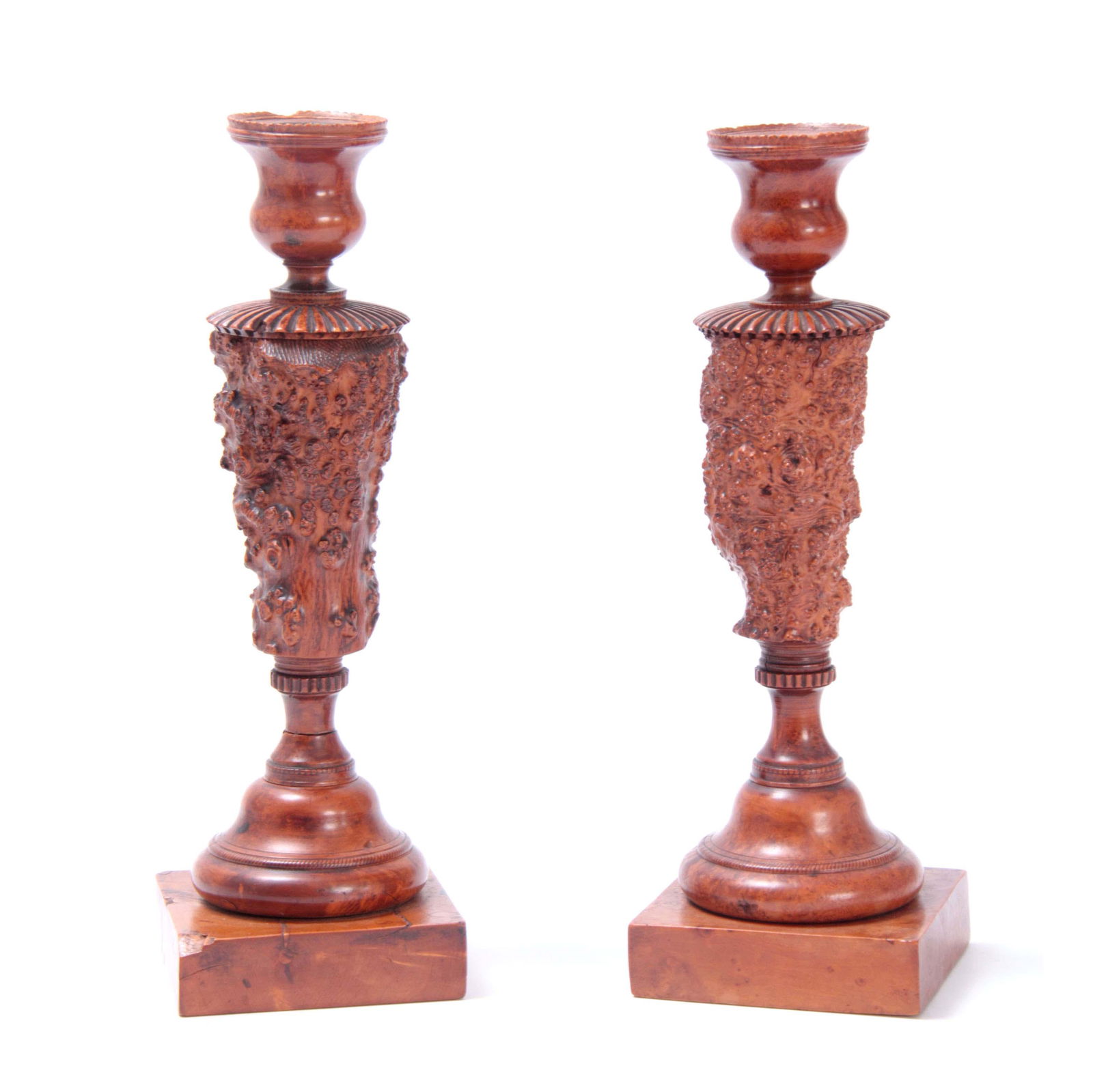 AN UNUSUAL PAIR OF GEORGE III YEW WOOD TREEN CANDL