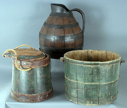 SoldLot of Early Wooden Buckets PlusAll 19th century including a fine bentwood measure with wrought iron strapping and lip, " diameter & high; plus two miniature buckets, one single piece of wood carved and one stave construction, eachSee Sold Price