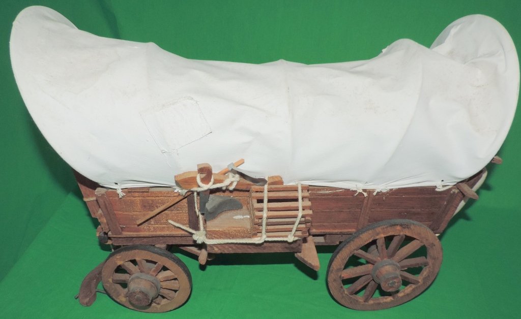 SoldCovered Chuck Wagon ModelThe detail in this model of a horse drawn covered chuck wagon is impressive. From the metal banded wagon wheels and barrel to the articulated yoke, the craftsmanship is evident. Condition (Excellent).See Sold Price