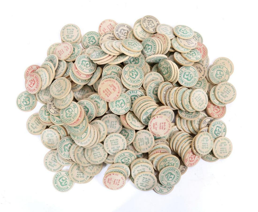 SoldWooden Nickel Hoard, Group 3 [139769]Over a thousand wooden nickels from all over the United States. Date: Country (if not USA): State: City: Provenance:See Sold Price