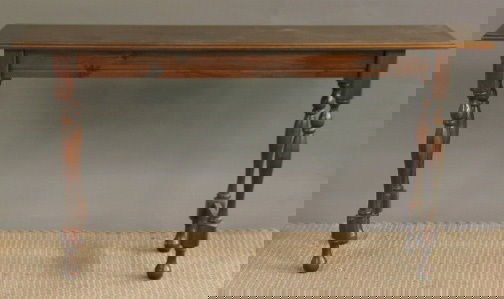 SoldVikki Carr | Provincial Sofa TableProvincial wooden sofa / console table, long form shaped wooden top supported with stretcher and connected with four bowed legs, includes Certificate of Authenticity as from The Collection of Vikki CaSee Sold Price