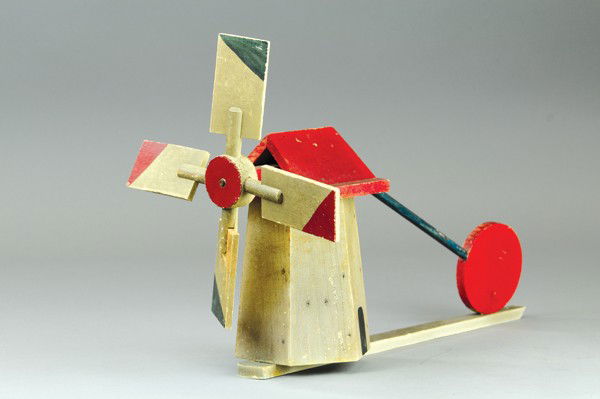 SoldWhimsical Whittled Folk Art Miniature Weathervanehand carved wooden weathervane in tower form with carved birds and rooster surmount, together with a small puzzle ball carving. Vane: 17 1/2" high, 9" diameter.See Sold Price