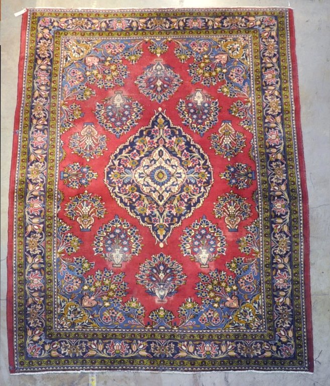 SoldRUG: Fine Sarouk, 7' x 10', wool on cotton, red field, blue major border, classic design elements,RUG: Fine Sarouk, 7' x 10', wool on cotton, red field, blue major border, classic design elements, wear consistent with age and use.See Sold Price